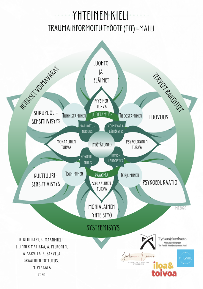 Suomalainen Yhteinen kieli -TIT-malli (Traumainformoitu työote), jota kehitimme monialaisessa yhteistyössä Työsuojelurahaston tuella, korostaa turvallisuutta, luottamusta ja myötätuntoa laadukkaan ihmistyön peruskivinä. Myötätunto sijoitettiin mallin keskiöön, sillä traumoista toipuminen vaatii ennen kaikkea turvallisen ja myötäelävän ympäristön.